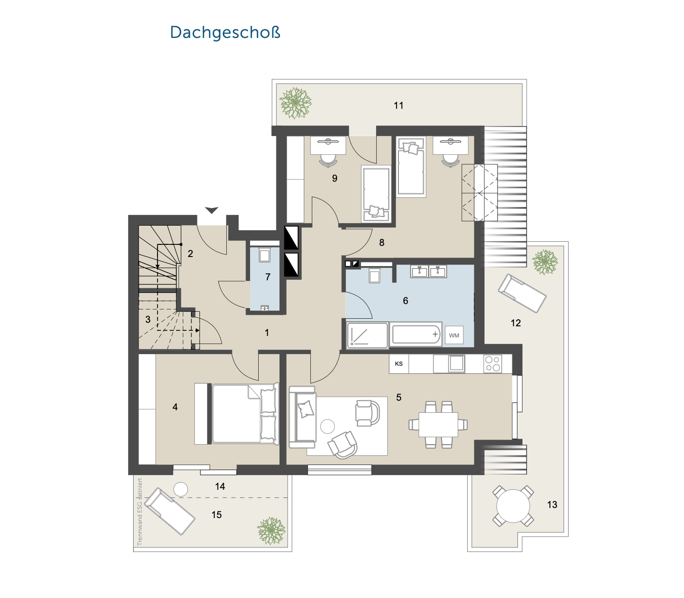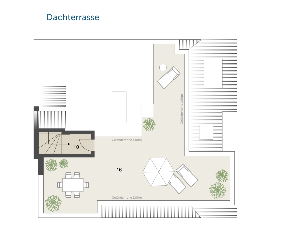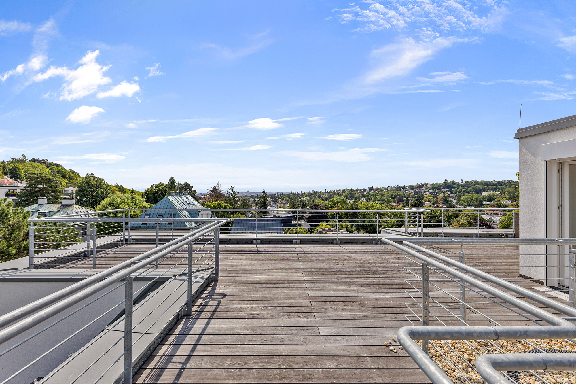 Eines der Highlights dieser Wohnung sind die zahlreichen Freiflächen mit insgesamt ca. 99 m². Die Dachterrasse mit einer Fläche von ca. 60 m², bietet ein sehr hohes Maß an Privatsphäre und einen atemberaubenden Ausblick in Richtung Innenstadt.